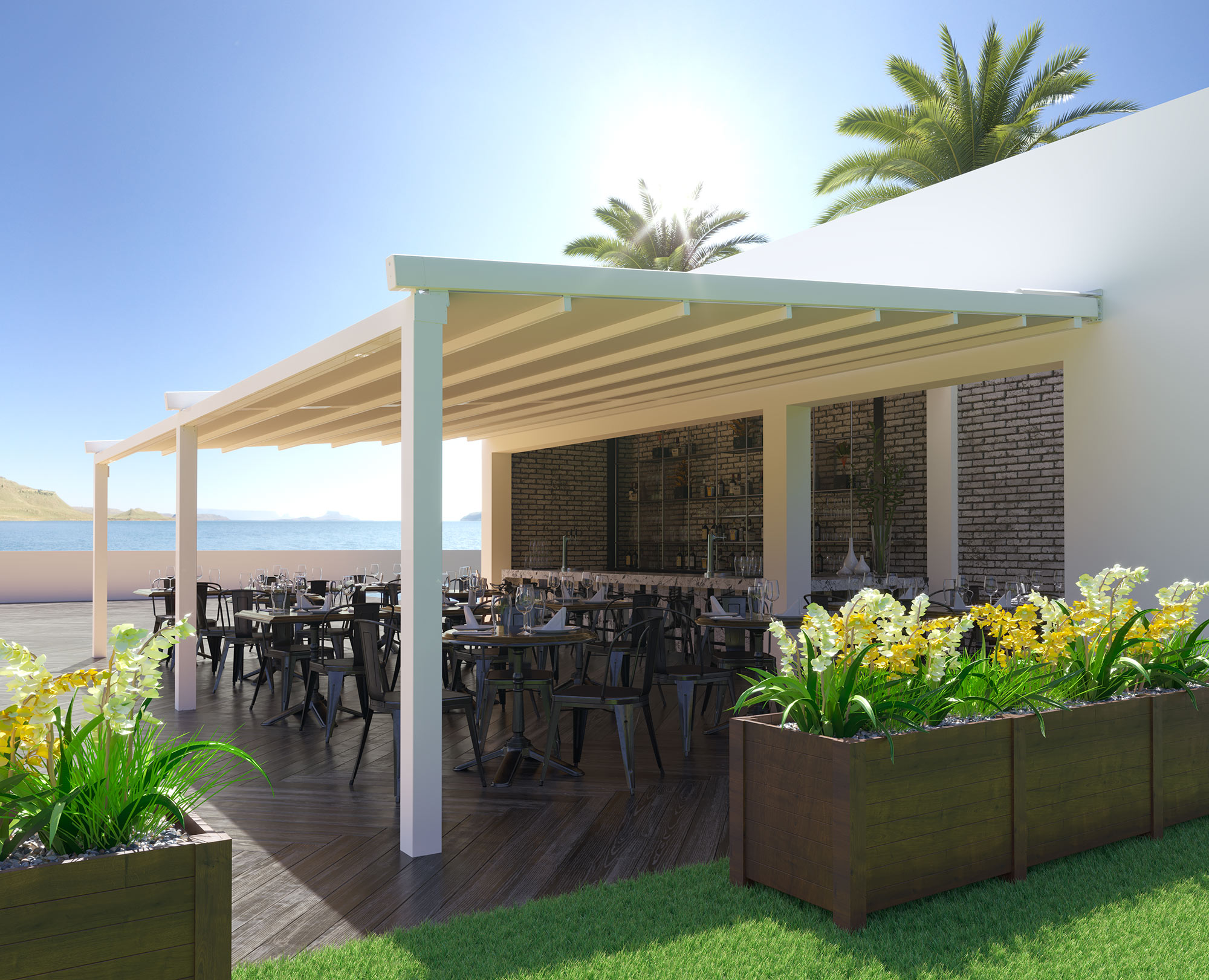 Una tenda a pergola con telo di protezione in PVC ignifugo, realizzata in profili di alluminio laccati con processi che garantiscono una perfetta protezione dalla corrosione ambientale. L’evacuazione dell’acqua raccolta sulla tenda defluisce lateralmente sulla trave frontale, che funge anche da gronda. Oltre alla resistenza alla pioggia e al vento, Lipari offre un’ottima protezione dal sole.
