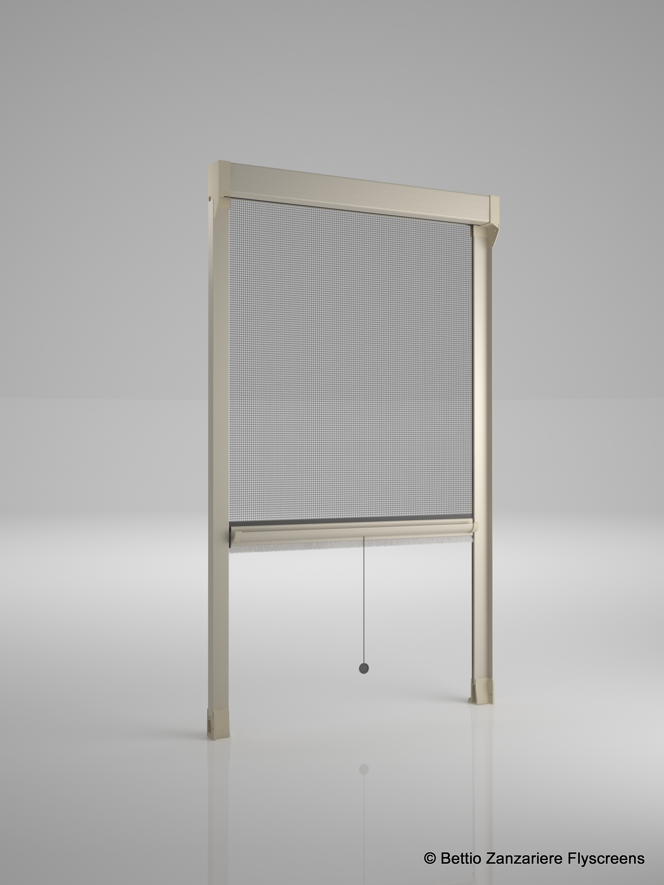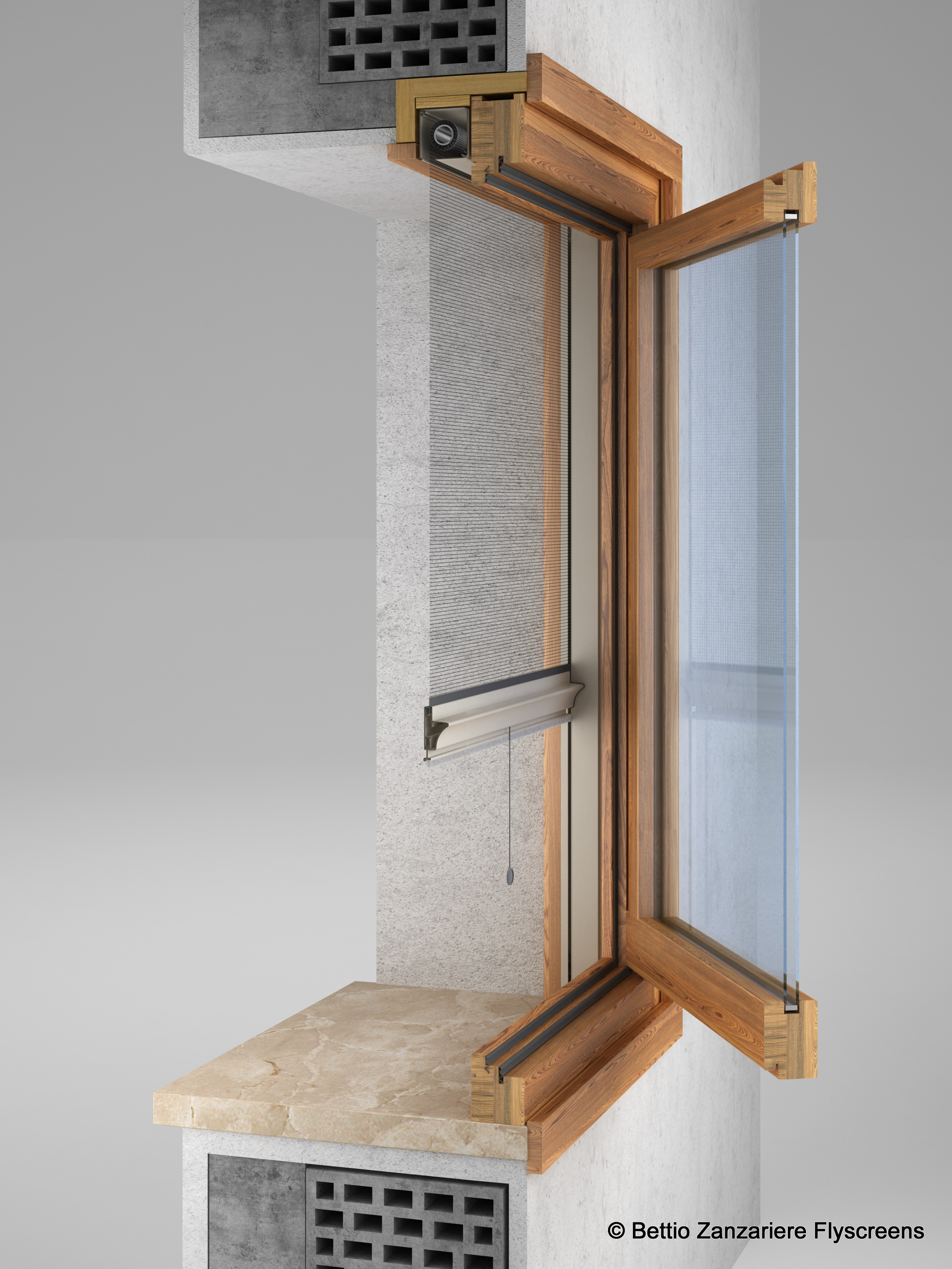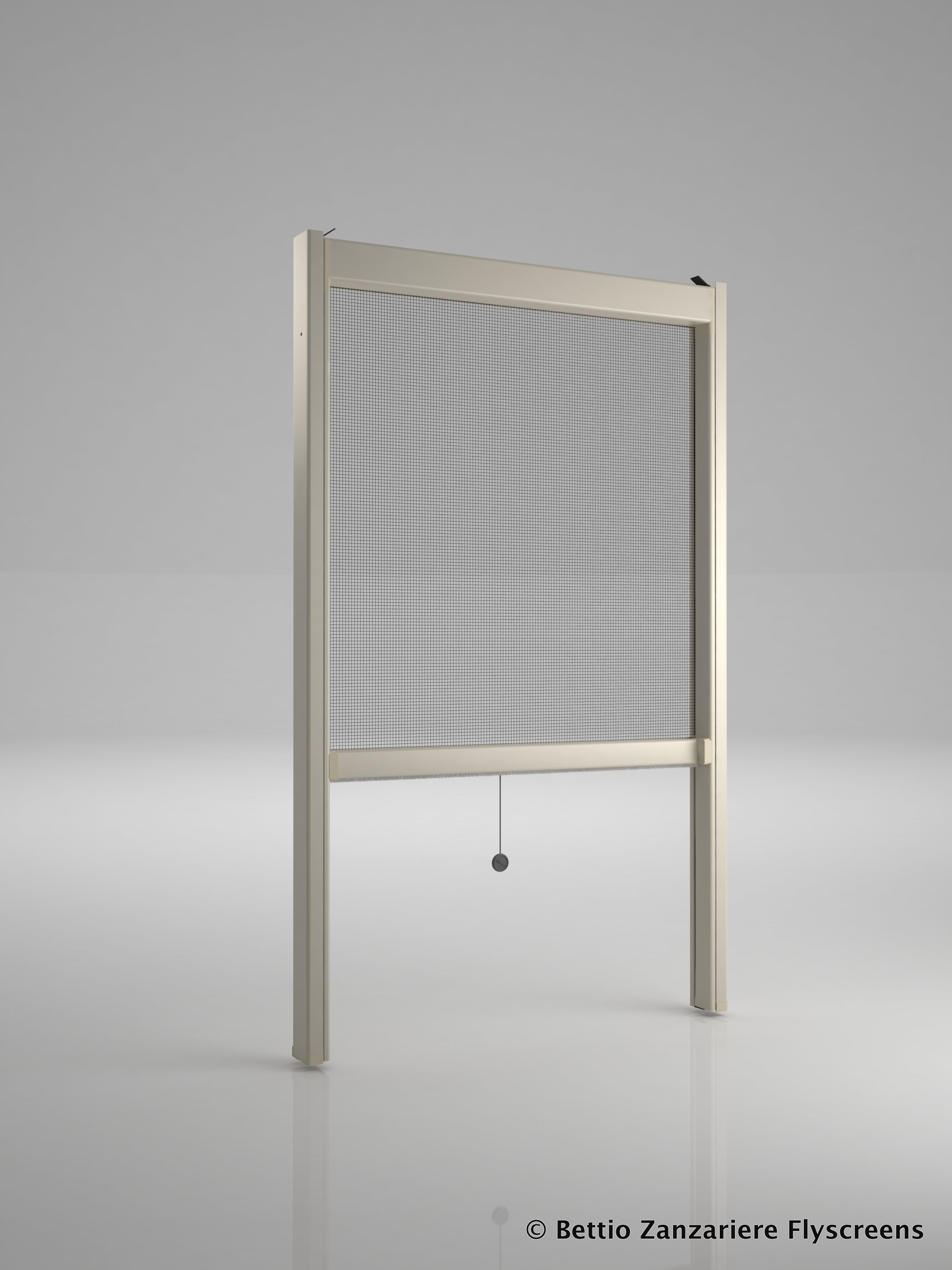 Zanzariera con rete in fibra di vetro e movimentazione a molla con l’esclusivo sistema clic-clak® di aggancio e sgancio, il Brevetto internazionale Bettio che consente di aprire e chiudere la zanzariera con un semplice gesto della mano.