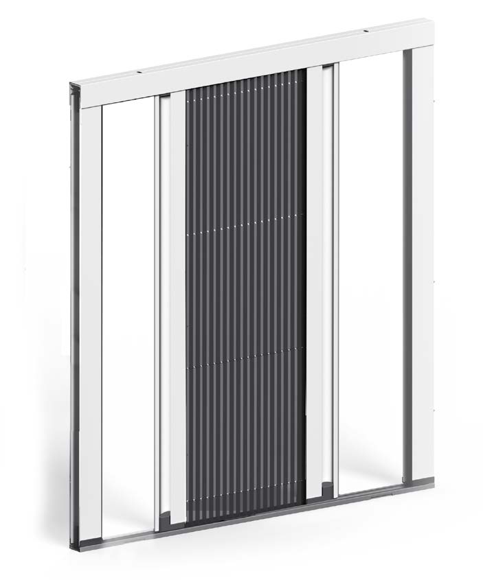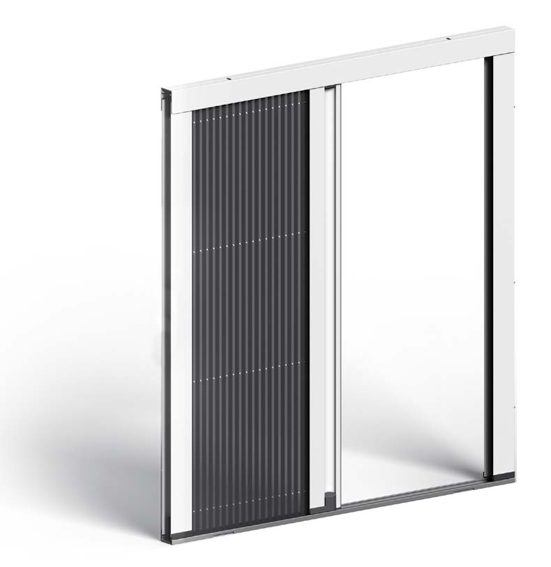 Zanzariera per porte-finestre. La sua particolare struttura, caratterizzata da due profili scorrevoli che permettono l’impacchettamento e l’estensione totale della rete da entrambi i lati, la rende molto indicata in abbinamento agli infissi scorrevoli.